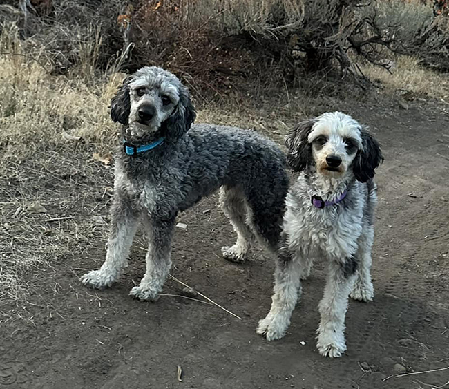 I have two dogs, Bodhi and Saul. They’re littermates, about four years old, and three-quarters mini-poodle, a quarter Australian Shepherd. Saul’s coat is the shaggy blue merle of a shepherd; Bodhi’s is the curly phantom black and gray of a poodle. They’re both leggy and about 17 lbs. with the sensitive feelings and chill vibe of most doodles. Equally down to watch Netflix or go on a hike, they’ve been good companions to us.